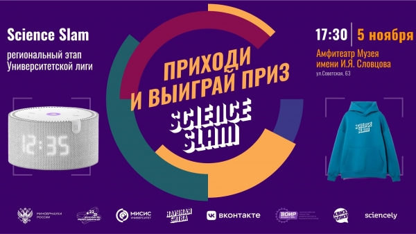 В этом году региональный этап Университетской лиги Science Slam состоится в Тюмени 05 ноября 2025 года в 17:30 часов в Амфитеатре Музея имени И.Я. Словцова, по адресу: ул. Советская, 63.